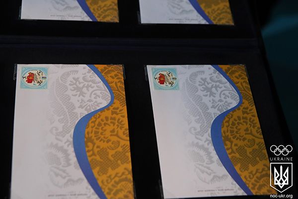 Конверт, на якому було погашено олімпійську поштову марку, виконано дизайнером Оксаною Шукліновою. Він містить кольори прапору України і національний орнамент. Штемпель для погашення поштової марки відповідає стилістиці марки.