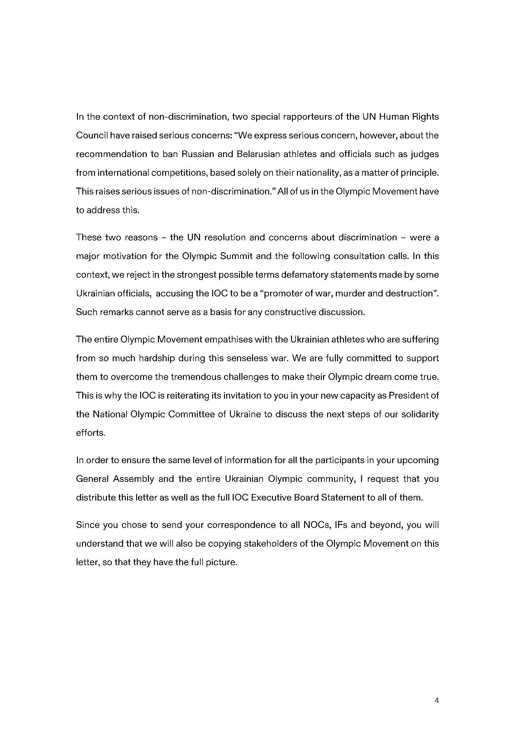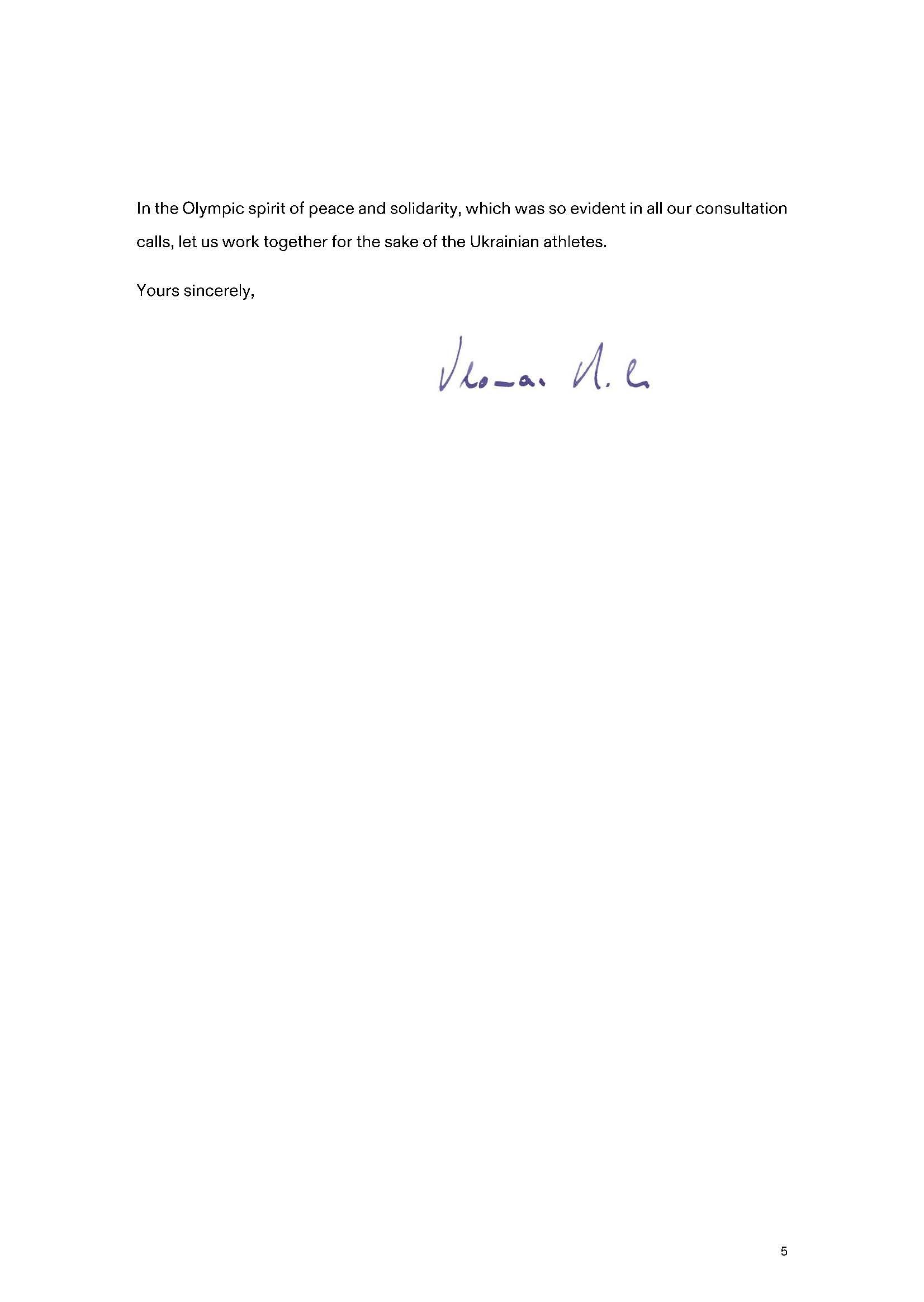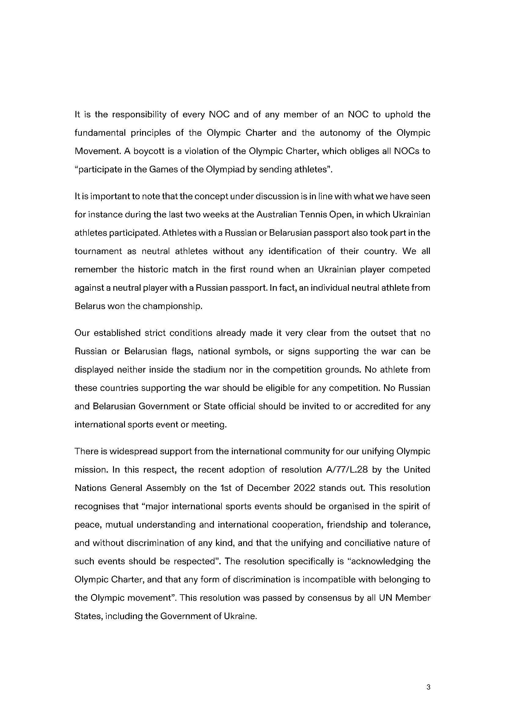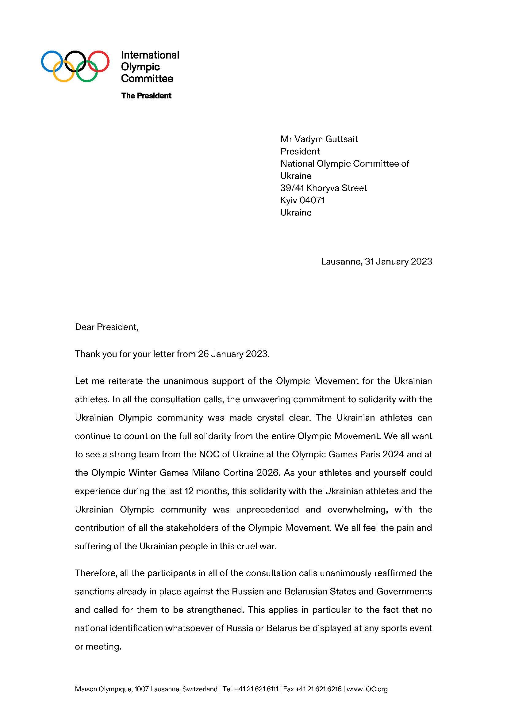 У відповідь на лист Національного олімпійського комітету України від 26 січня 2023 року (можна ознайомитися за посиланням: https://noc-ukr.org/news/23239/) 31 січня 2023 року Міжнародний олімпійський комітет надіслав листа, в якому висловив свою позицію в питанні можливої участі російських та білоруських спортсменів у міжнародних змаганнях.