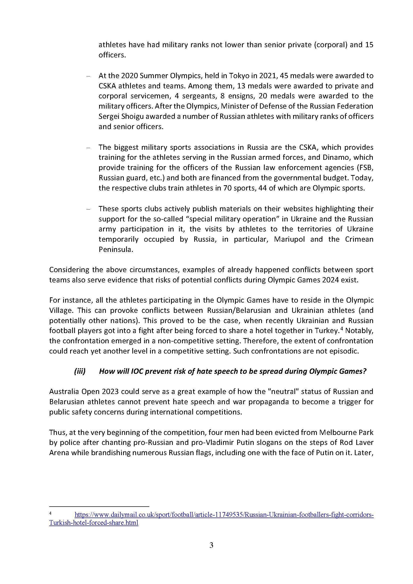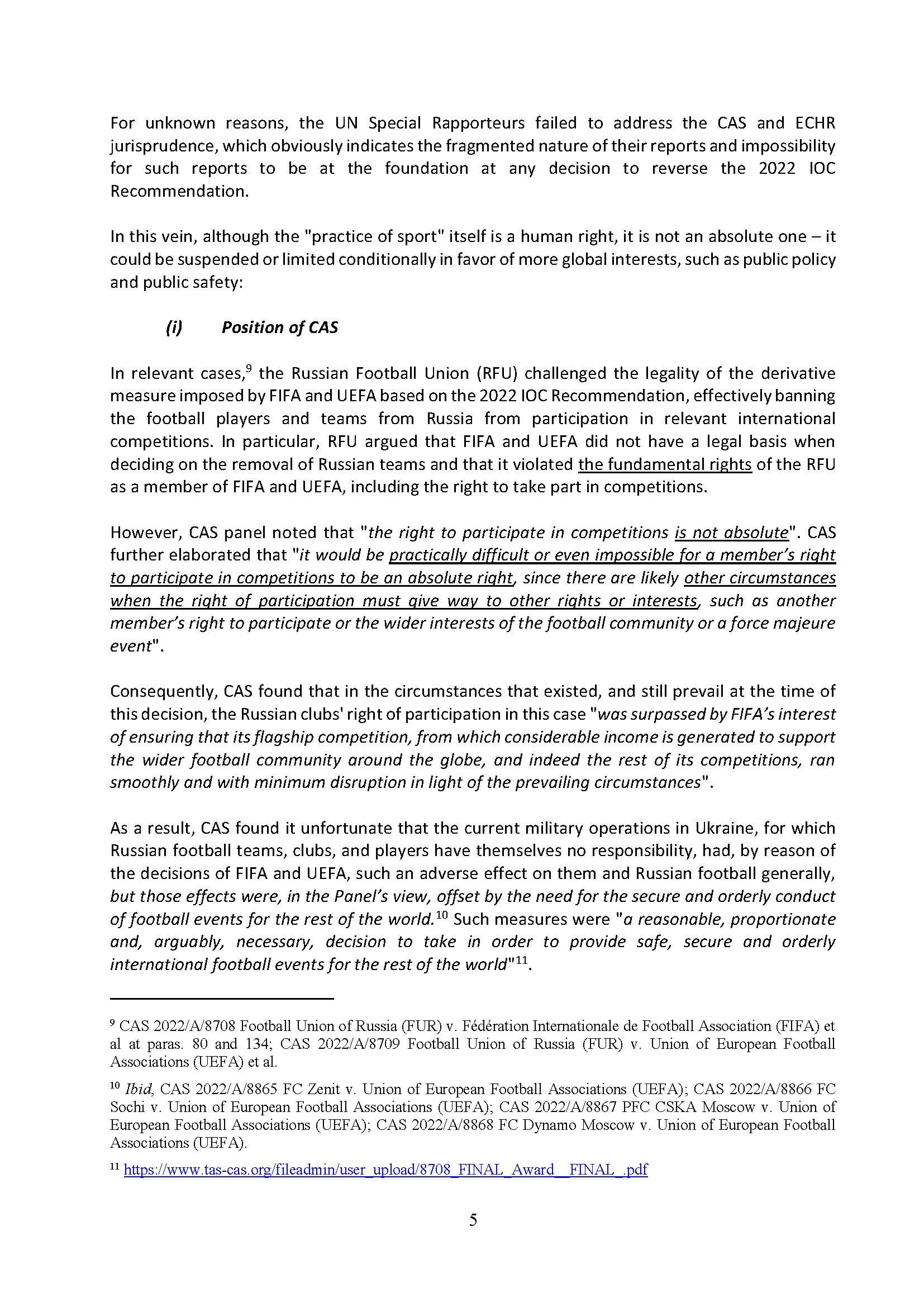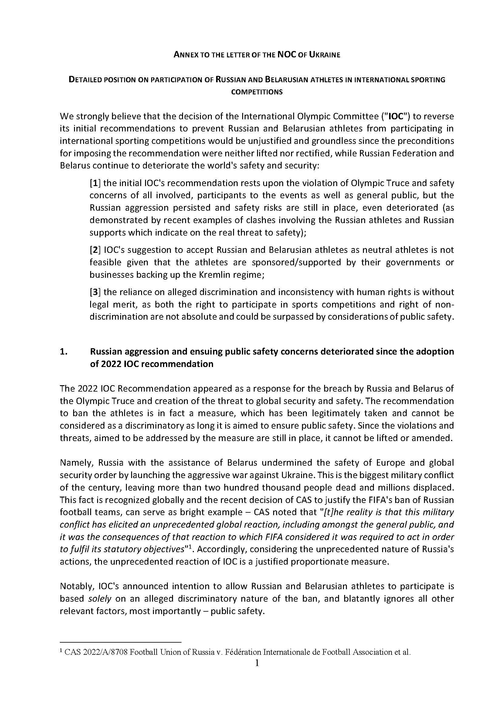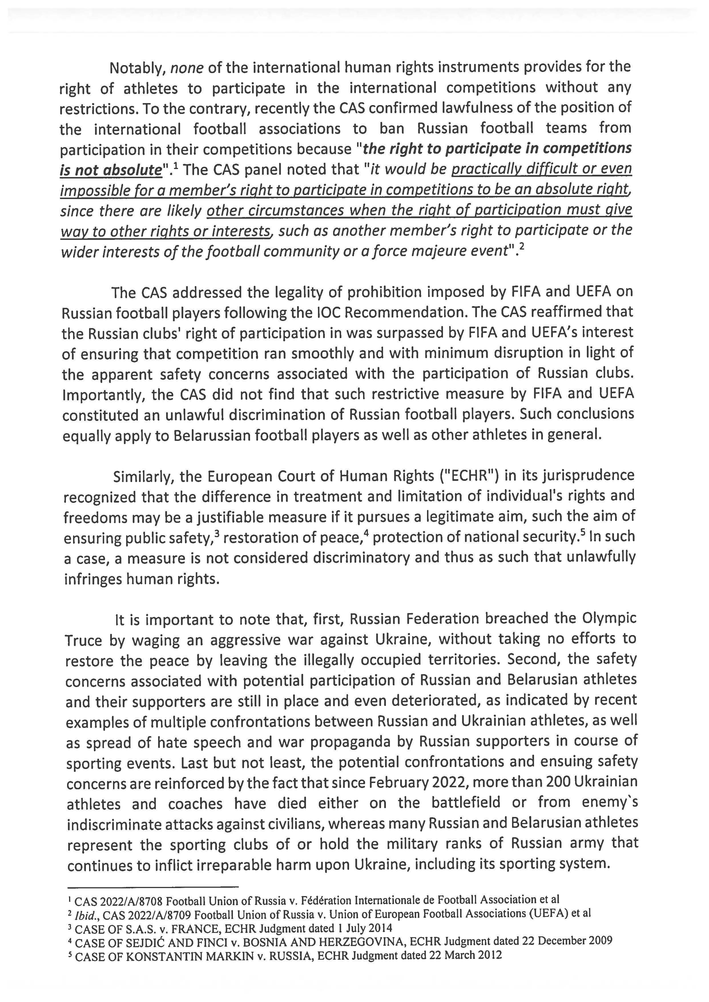 Викладений правовий аналіз ситуації грунтується на судовій практиці Арбітражного спортивного суду та Європейського суду з прав людини, який дає право говорити, що «доповідь спеціальних доповідачів ООН, яка послужила основою для перегляду позиції МОК, не врахувала принаймні відповідну судову практику CAС та ЄСПЛ, проігнорувала неабсолютний характер залучених прав та обставини, що склалися внаслідок російської агресії проти України. Тому неприйнятно, щоб фрагментовані та необґрунтовані висновки спеціальних доповідачів ООН слугували підставою для будь-якого подальшого рішення МОК», - зазначено у листі.