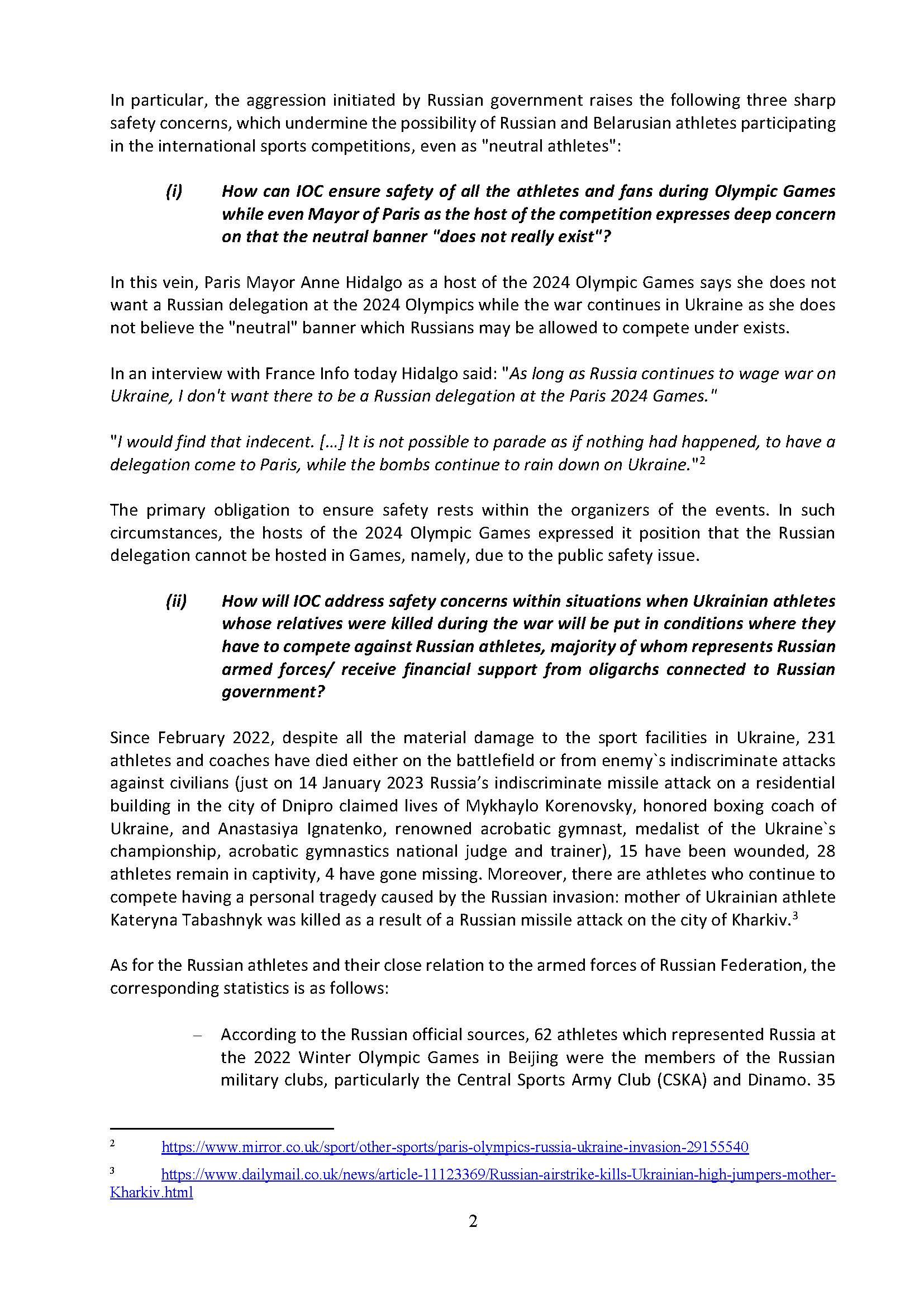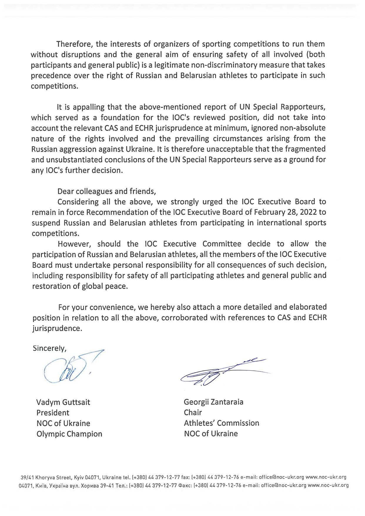 Україна вкотре закликала світову спортивну спільноту продовжити раніше визначені обмеження щодо представників країн-агресорок до міжнародних змагань. Однак, у випадку, якщо Виконавчий комітет МОК вирішить дозволити участь російських і білоруських спортсменів у міжнародних змаганнях, усі члени Виконкому МОК повинні взяти на себе персональну відповідальність за всі наслідки такого рішення, включаючи відповідальність за безпеку всіх спортсменів-учасників і громадськості та відновлення глобального миру.