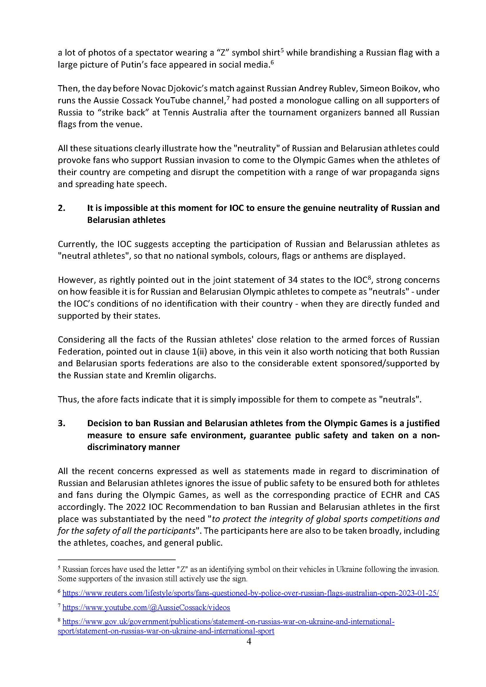 Зокрема, у листі зазначено про те, що «інтереси організаторів спортивних змагань щодо їх безперебійного проведення та загальна мета забезпечення безпеки всіх учасників (як учасників, так і громадськості) є законним недискримінаційним заходом, який має перевагу над правом російських і білоруських спортсменів брати участь у таких змаганнях».