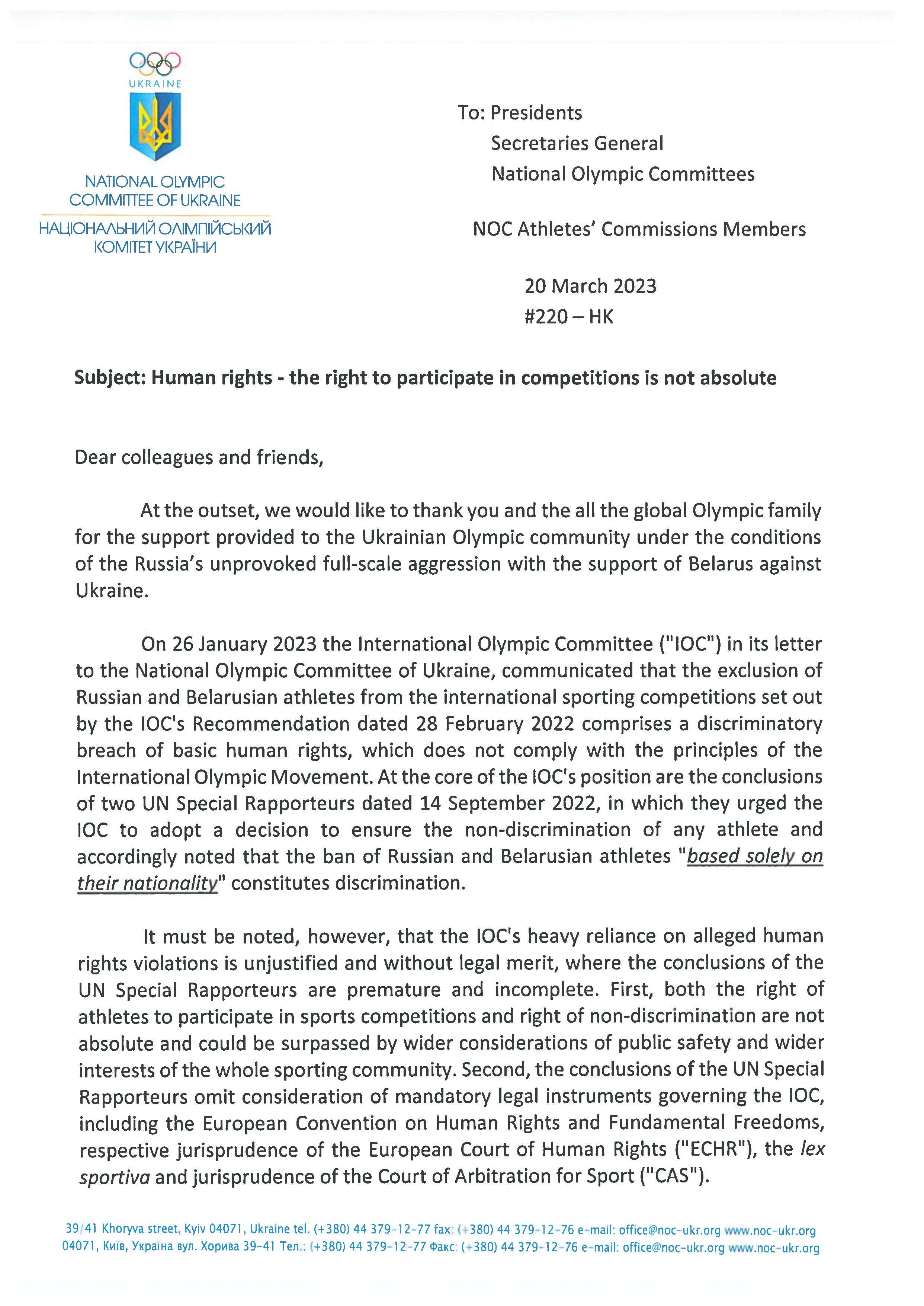 Сьогодні, 21 березня 2023 року, Національний олімпійський комітет України надіслав президентам і генеральним секретарям Національних олімпійських комітетів, а також міжнародних федерацій з олімпійських видів спорту листа, в якому викладено юридичні аспекти питання захисту прав людини та приклади судової практики з цього питання. При цьому Україна вкотре закликала всіх до об’єднання задля продовження Рекомендації Виконкому МОК від 28.02.2022 року про відсторонення російських і білоруських спортсменів від участі в міжнародних спортивних змаганнях.