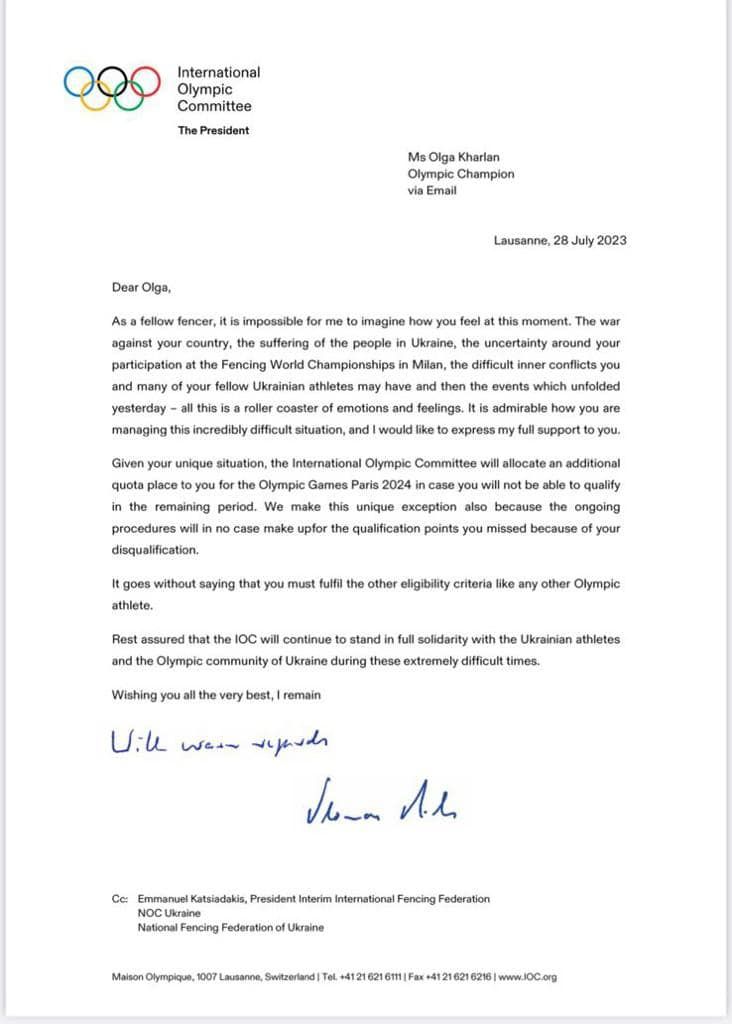 «Міжнародний олімпійський комітет виділить Вам (Ользі Харлан – авт.) додаткову квоту на Олімпійські ігри в Парижі 2024 року, якщо Ви не зможете пройти кваліфікацію протягом періоду, що залишився», - йдеться у листі МОК, адресованому українській шаблістці Ользі Харлан.
