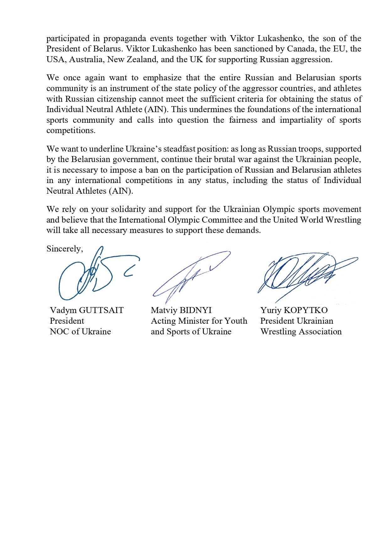 Президент Національного олімпійського комітету України Вадим Гутцайт, т.в.о. Міністра молоді та спорту України Матвій Бідний та президент Асоціації спортивної боротьби України Юрій Копитко надіслали спільного листа Міжнародному олімпійському комітету у зв’язку з кваліфікацією на Париж-2024 представників Російської Федерації і Білорусі, які відкрито підтримують воєнні дії проти України.