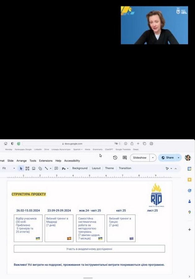 Під час засідання голова Комісії Ольга Данько поінформувала присутніх про інноваційний проєкт «Road to the Olympics for Ukrainian Athletes» (RtO), який реалізується НОК України за фінансової підтримки Європейського Союзу. Вона розповіла про цілі проєкту, партнерів та їх зону відповідальності, а також особливості його реалізації.
